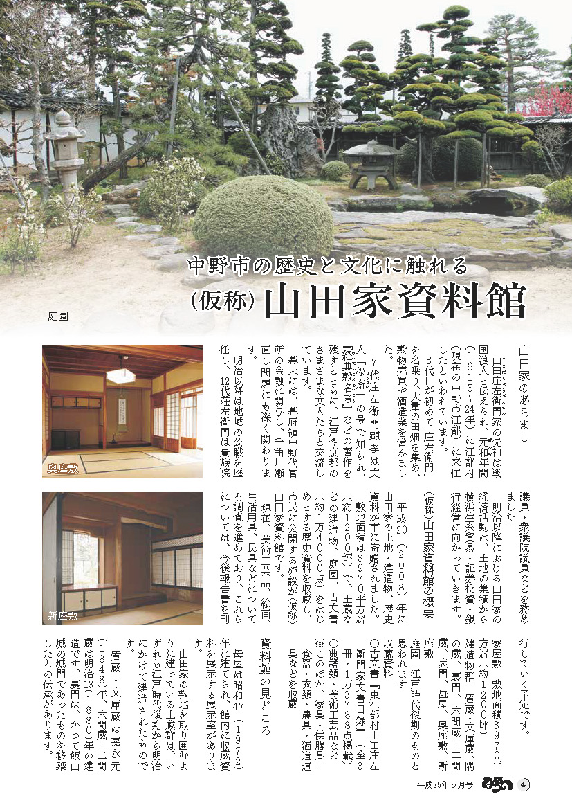 (仮称)山田家資料館は平成20年、故山田顕五氏(中野市大字江部)より、中野市に寄贈された土地、家屋、収蔵品を歴史資料として後世に伝え、活用するために平成22年4月開設され、希望者に公開しています。