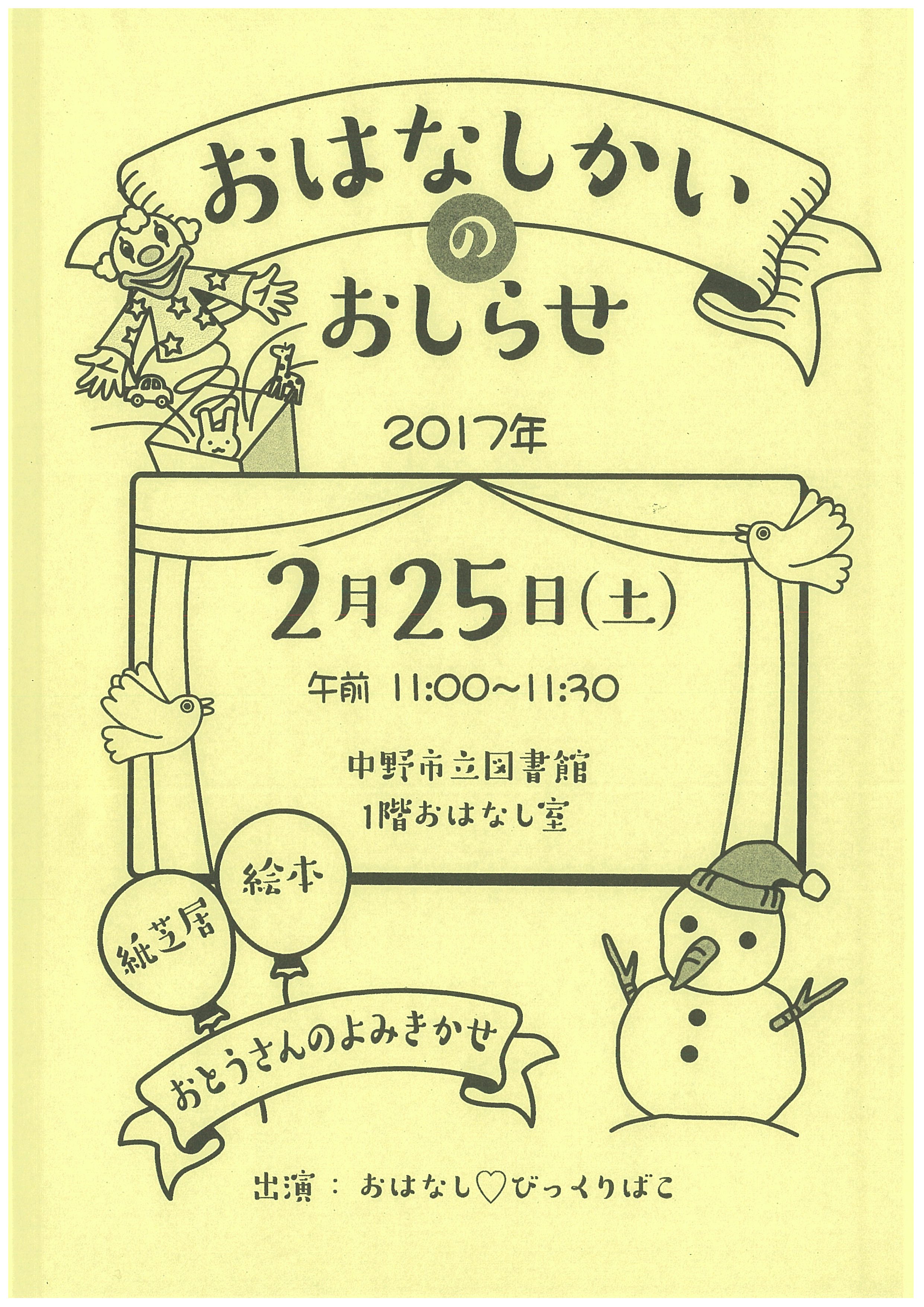 おとうさんのよみきかせ「おはなしかい」 2022 7/28 イベント情報 小さなお子さんのための絵本や紙芝居のよみきかせの会です。 どうぞ、お出かけください。 【記事出稿:中野市庶務課秘書広報係】 イベント情報 よかったらシェアしてね! URLをコピーしました! URLをコピーしました! なんだ屋ツキイチごはん会「精進料理をつくろう」 2月18日(土)・19(日)モデルハウス見学会開催 関連記事 新春モデルハウス見学会 2026年1月8日 2025年 春わくわくぽんぽこセール 2025年3月7日 ぽんぽこカード12周年記念 ガラポン抽選会・おまとめ会 2024年10月1日 2024年 夏どきどきぽんぽこセール 2024年7月25日 住まいの完成見学会開催! 2024年5月25日 北信濃ふるさとの森文化公園スプリングフェア 2024年5月13日 歩いて健康フェスタ 2024年5月13日 書家 久保皐泉 初個展 「令和」にふり返る“書のある暮らし” 2024年3月13日