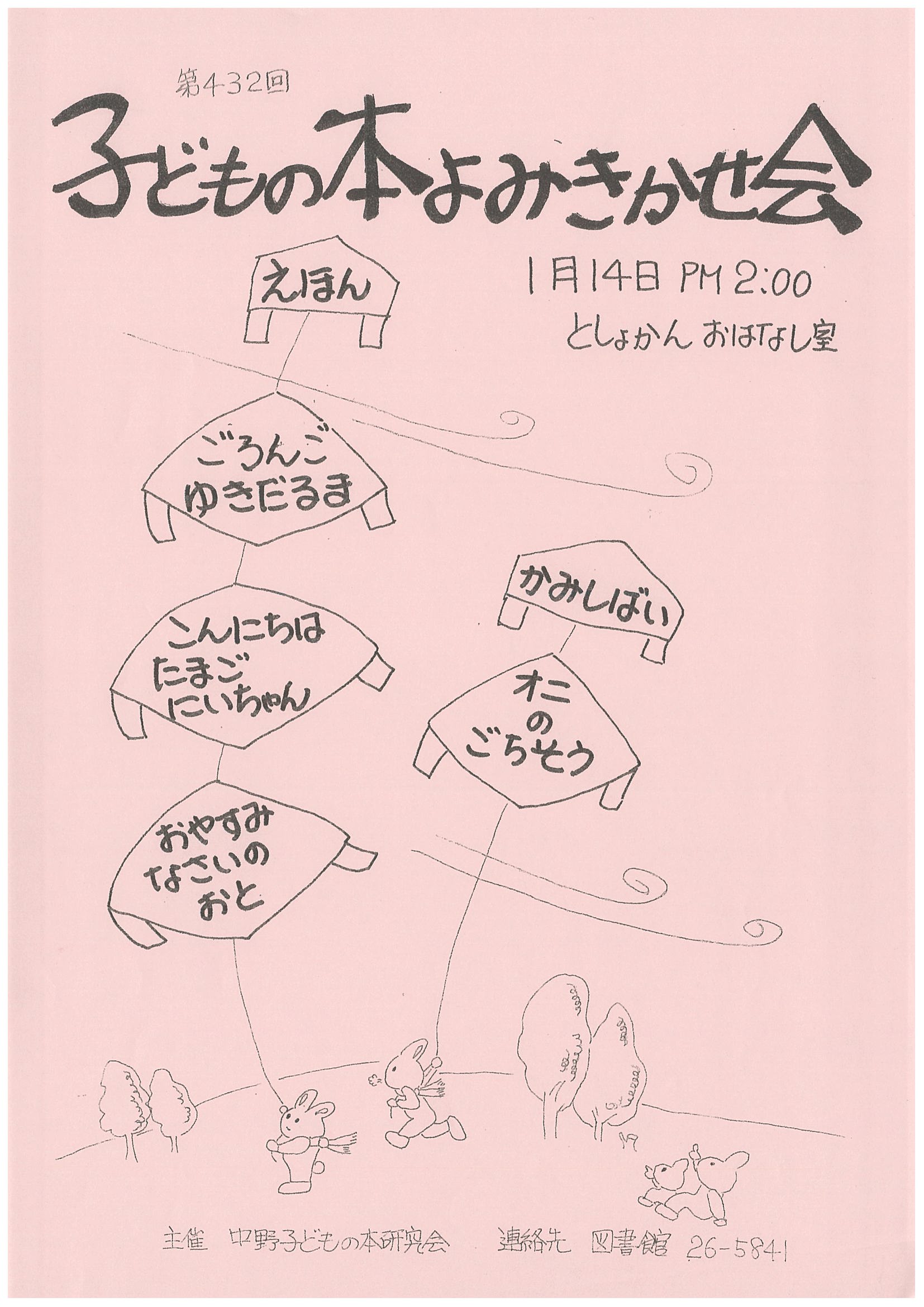 子どもの本よみきかせ会 2022 7/28 イベント情報 小さなお子さんのための絵本の読み聞かせ会が開催されます。 どうぞおでかけください。 中野市立図書館 http://www.nakano-lib.jp/ 【記事出稿:中野市庶務課秘書広報係】 イベント情報 よかったらシェアしてね! URLをコピーしました! URLをコピーしました! 世界の音楽と儀仗奏楽の旅 【新春特別企画】シャチョー松村の勝手に酒場放浪記 Vo.5 関連記事 新春モデルハウス見学会 2026年1月8日 2025年 春わくわくぽんぽこセール 2025年3月7日 ぽんぽこカード12周年記念 ガラポン抽選会・おまとめ会 2024年10月1日 2024年 夏どきどきぽんぽこセール 2024年7月25日 住まいの完成見学会開催! 2024年5月25日 北信濃ふるさとの森文化公園スプリングフェア 2024年5月13日 歩いて健康フェスタ 2024年5月13日 書家 久保皐泉 初個展 「令和」にふり返る“書のある暮らし” 2024年3月13日