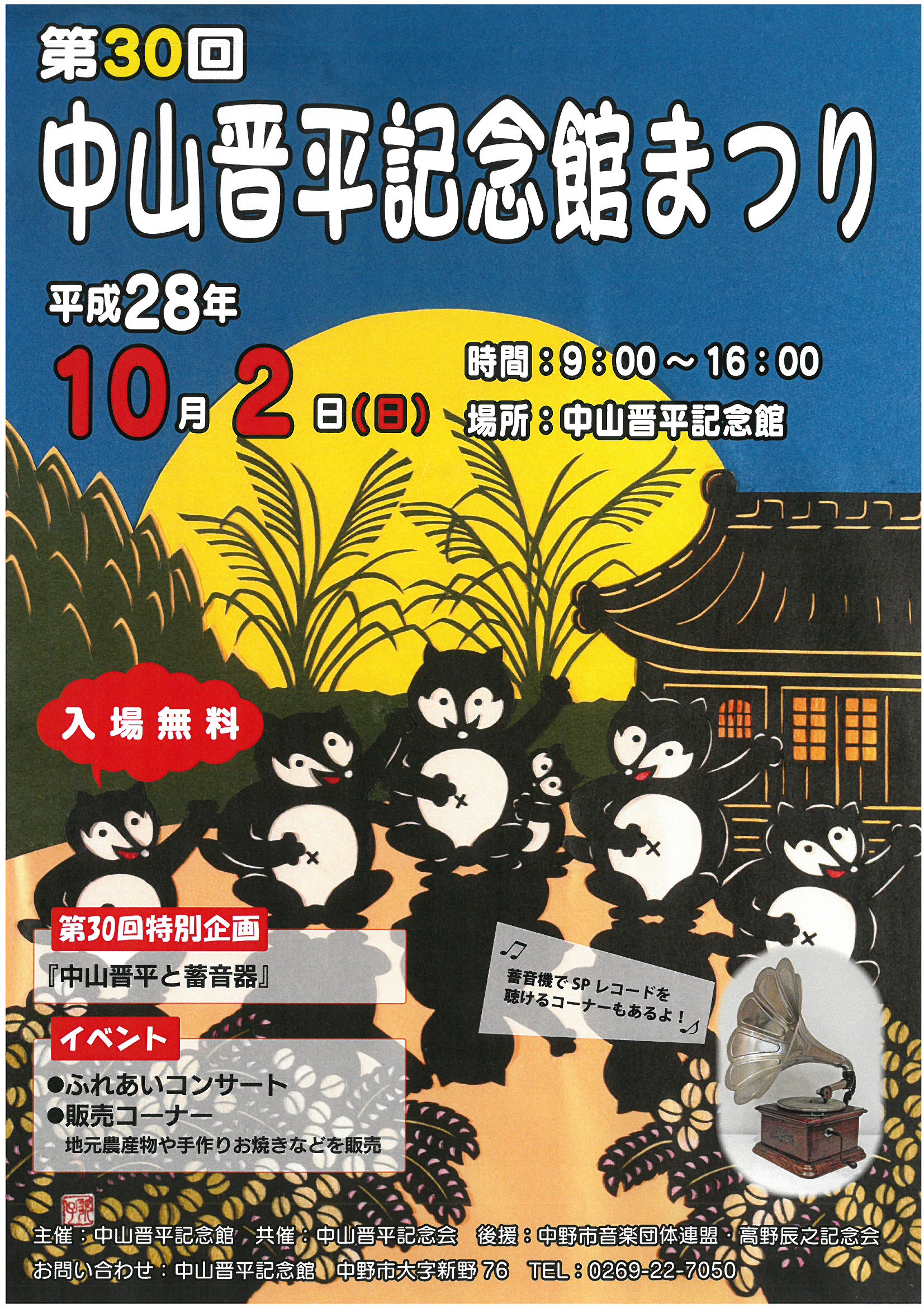 市内外36団体の音楽愛好グループや個人の皆さんによる、中山晋平・高野辰之作品を中心とした合唱・フルート・オカリナ・ハーモニカなどの演奏をお楽しみいただける『ふれあいコンサート』と、地元農産物やおやきなどの販売があります。
